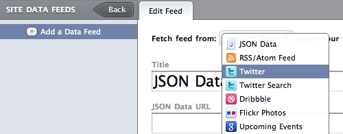 Data Feeds at its core is a background service we’ve added to Harmony that polls feeds that you specify. These can be json or xml feeds, like Twitter, Google Calendar, or your rss feed from another site. We’ve predefined a few to make it easy to get started.